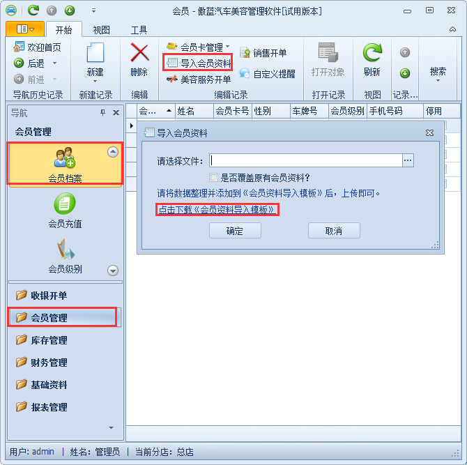 ②下載軟件中的會員檔案模板。點擊【會員管理】→【會員檔案】→“導入會員資料”→點擊下載《會員資料導入模板》,如圖:
