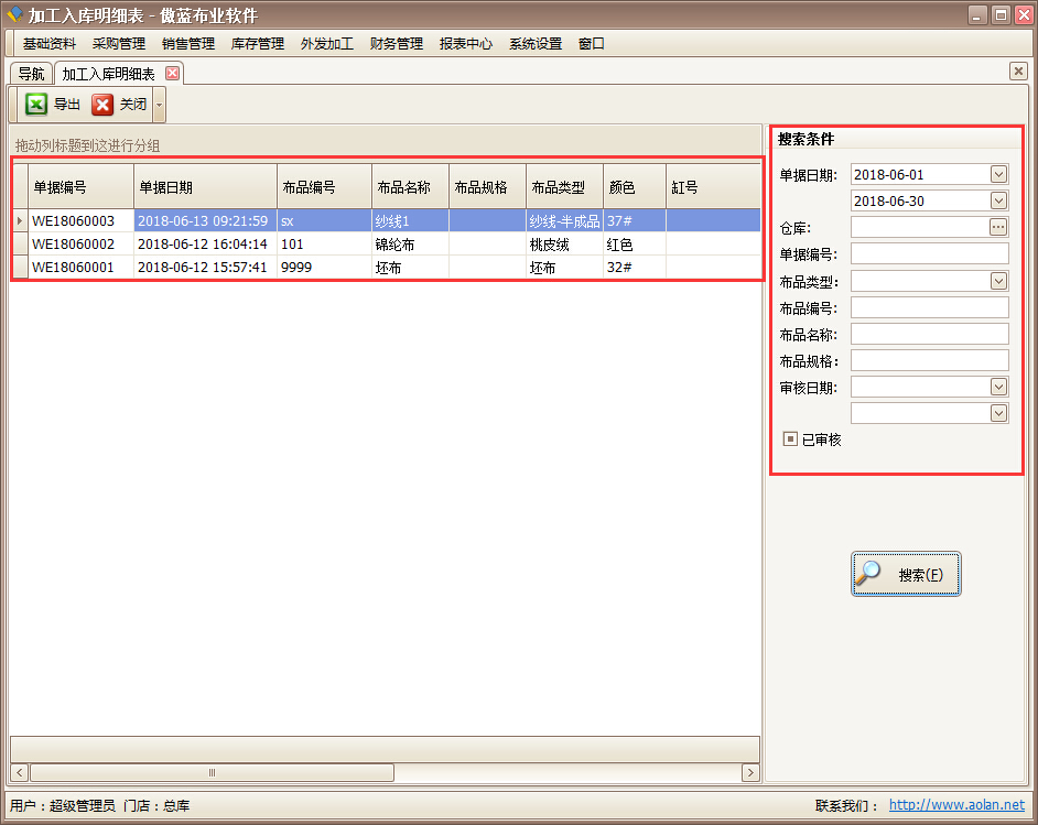 傲藍(lán)布業(yè)管理軟件查看加工入庫的布匹情況報表: