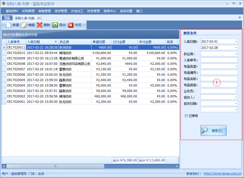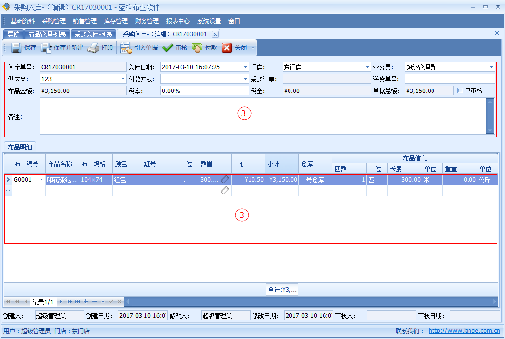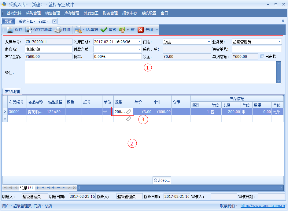 傲藍布行管理系統,主要是對采購回來的布品,進行錄入入庫。【采購入庫】單具體中記錄了采購布匹的單據日期、引用采購單據編號、供應商、送貨單、入庫的倉庫、單據總金額、稅率、稅金等信息。明細列表中包括單據采購布品名稱,顏色,單位,數量價格等詳細數據。