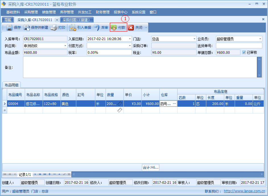 如需要為當前入庫單進行付款,具體步驟如下圖;