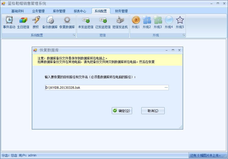 電腦在使用過程由于中病毒或者系統(tǒng)崩潰造成數(shù)據(jù)丟失,傲藍(lán)鞋帽銷售管理軟件提供了數(shù)據(jù)恢復(fù)功能,數(shù)據(jù)可以隨時恢復(fù)。下面介紹數(shù)據(jù)的恢復(fù)操作 登錄傲藍(lán)鞋帽銷售管理軟件后在【系統(tǒng)配置】導(dǎo)航點(diǎn)擊【恢復(fù)數(shù)據(jù)庫】,在彈出的恢復(fù)數(shù)據(jù)庫界面中選擇以前備份的數(shù)據(jù)庫文件,然后點(diǎn)擊“確定”,這樣就恢復(fù)數(shù)據(jù)庫了,如下圖: