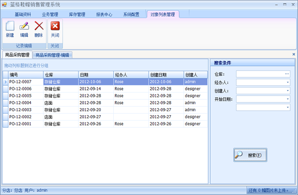 點擊【業務管理】->【商品采購】, 打開商品采購列表界面,該界面可以進行查詢,查詢相關的商品采購單信息,雙擊該采購單據打開商品采購單據詳細信息界面。該界面包括編輯商品采購單,刪除商品采購單和建立新的商品采購三個功能。如下圖: