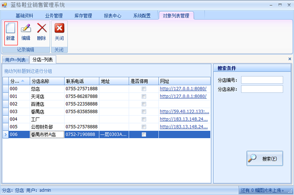 點擊【基礎(chǔ)資料】->【分店】打開分店-列表,這里顯示全部的分店信息。點擊【新建】進入分店配置頁面。