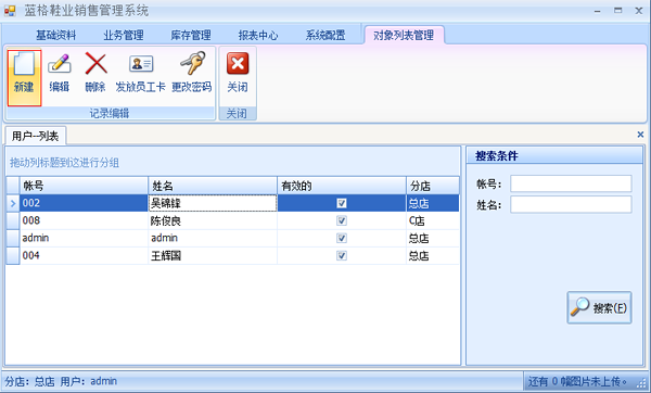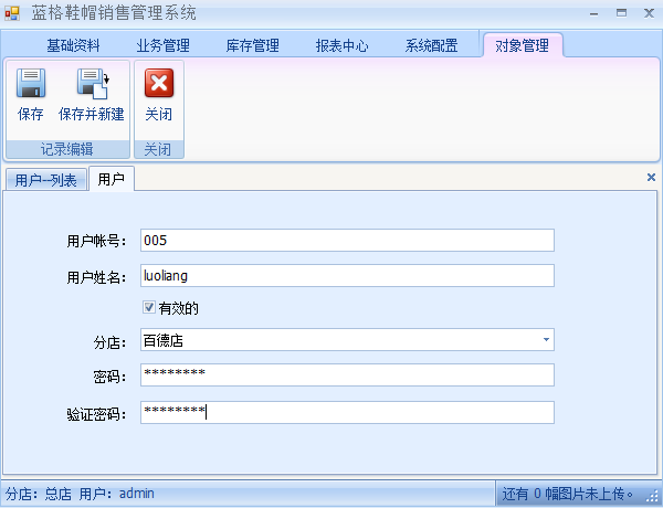 新建用戶信息包括:用戶帳號,用戶名稱,用戶密碼,所屬分店。