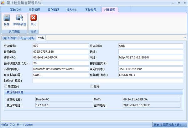 新建一個分店需要輸入分店編號,分店名稱,聯(lián)系電話,地址,授權(quán)MAC等等。