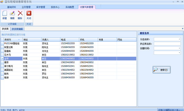 點擊【基礎(chǔ)資料】->【供應(yīng)商】, 打開供應(yīng)商列表界面,該界面可以進行查詢,查詢相關(guān)的供應(yīng)商信息,雙擊該供應(yīng)商打開供應(yīng)商詳細(xì)信息界面。包括編輯供應(yīng)商,刪除供應(yīng)商和建立新的供應(yīng)商三個功能。如下圖: