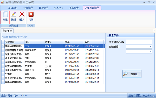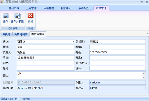 在上圖中點擊【新建】打開供應(yīng)商編輯界面。添加好供應(yīng)商相關(guān)的信息。然后點擊【保存】這樣就把供應(yīng)商錄入到系統(tǒng)中。當(dāng)在上圖中選擇一個供應(yīng)商點擊【編輯】,在該界面中會顯示選擇供應(yīng)商詳細(xì)的信息,修改其中的項目,然后點擊【保存】,供應(yīng)商的信息就更新完成。