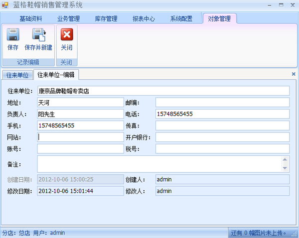 在上圖中點擊【新建】,打開往來單位-編輯界面,在界面上填寫相關(guān)的信息。填寫好之后點擊【保存】,這樣就包往來單位錄入到系統(tǒng)中了。