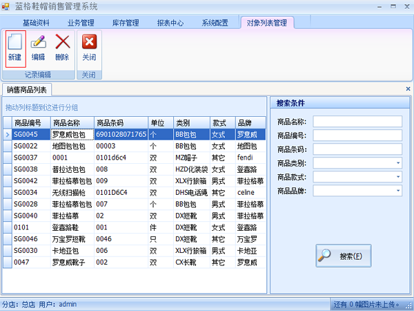 點擊【基礎(chǔ)資料】【商品檔案】打開銷售商品列表,這里顯示所有的商品基本信息。在搜索條件中輸入相關(guān)信息進行查找。