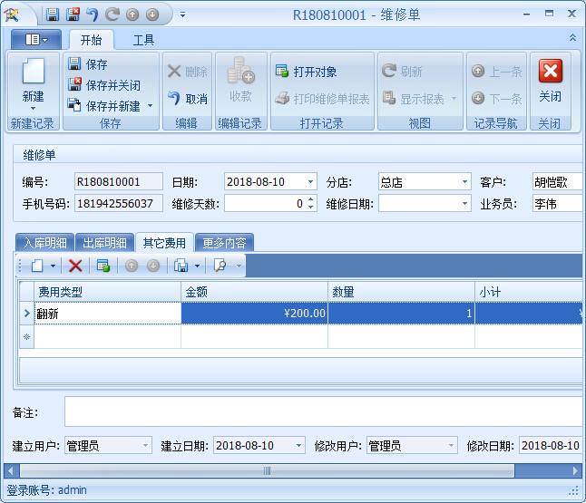 ①點擊軟件的【銷售管理】→【維修單】→“新建”進入維修單管理,選擇相應的客戶和業務院,如果是家具保養業務,將需要維修保養的產品填入入庫明細中,在其他費用中添加相應的保養項目費用即可,如果是贈送的服務就在金額中填0即可,如圖: