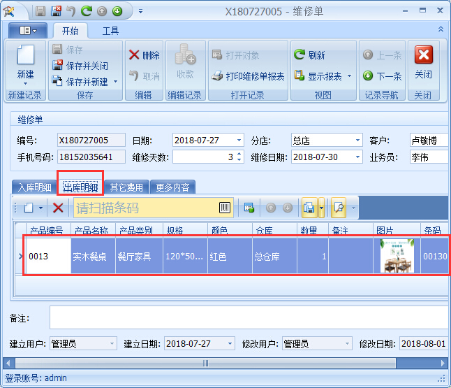 傲藍家具銷售管理系統在維修單進行出入庫的產品,在產品庫存管理中自動扣減或增加相應的庫存數量。