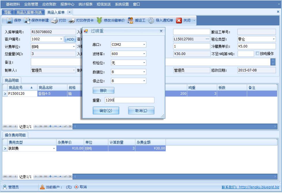 每批商品入庫,冷庫租賃管理軟件將會自動采集貨物過磅后顯示屏提供的貨物重量數(shù)據(jù),該數(shù)據(jù)即作為此批商品的入庫重量,系統(tǒng)通過商品重量自動計費入庫流程產(chǎn)生的雜費,如處置費、搬運費等。對于一旦入庫即收取冷藏費的收費方式,系統(tǒng)立即自動顯示冷藏費金額,并以此累計費用。