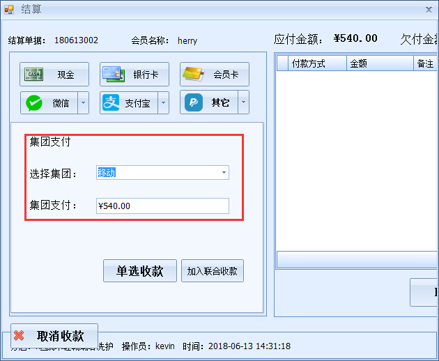 3、集團(tuán)會(huì)員進(jìn)店消費(fèi)時(shí),傲藍(lán)皮具養(yǎng)護(hù)店軟件會(huì)在收物開單結(jié)算時(shí)默認(rèn)為集團(tuán)支付,直接收款結(jié)算即可,如圖: