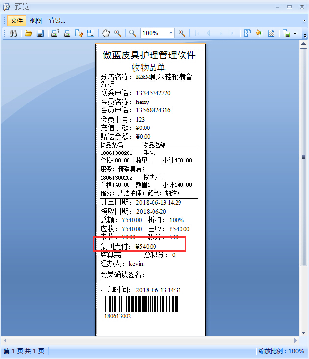 ①結(jié)算完成之后,軟件支持打印收衣單或收銀小票,在收衣單中也可以清楚的考到本次會(huì)員消費(fèi)時(shí)使用集團(tuán)卡支付,如圖: