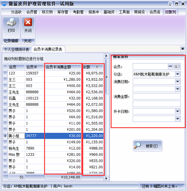 傲藍(lán)皮具護(hù)理會(huì)員管理軟件會(huì)員卡消費(fèi)記錄表,實(shí)現(xiàn)會(huì)員卡充值后的消費(fèi)情況,消費(fèi)明細(xì)功能,幫助店鋪及時(shí)了解店鋪會(huì)員卡內(nèi)的余額及消費(fèi)情況。