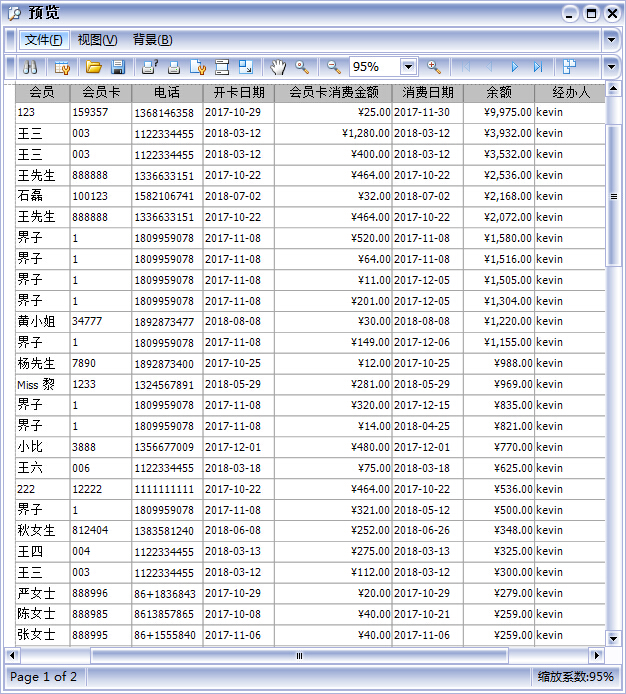 3、在皮具護(hù)理店會(huì)員管理軟件中會(huì)員消費(fèi)報(bào)表中點(diǎn)擊上面的打印,就可以查看該報(bào)表的打印預(yù)覽,非常的方便 ,如圖: