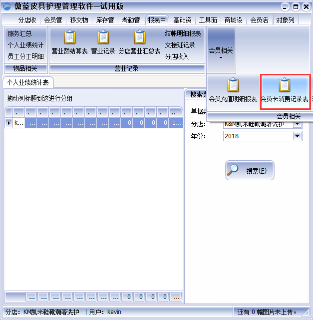 1、打開(kāi)傲藍(lán)皮具護(hù)理門(mén)店管理軟件,點(diǎn)擊【報(bào)表中心】欄目,找到【會(huì)員相關(guān)】下的“會(huì)員卡消費(fèi)記錄表”如圖: