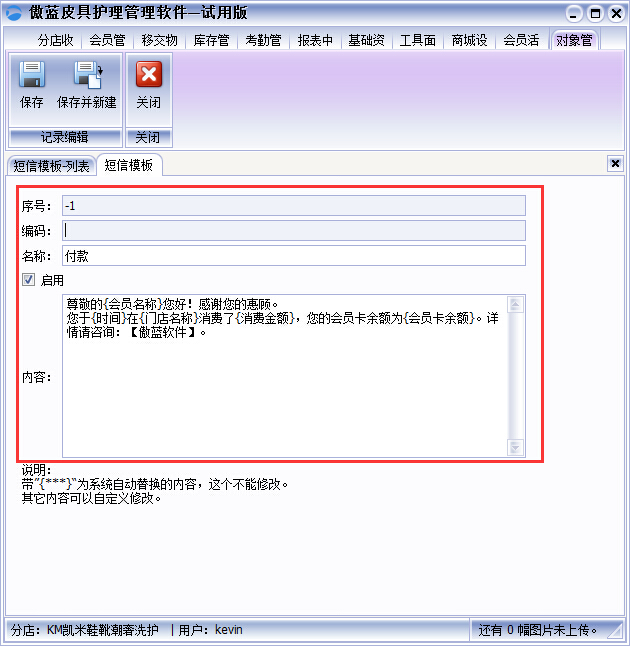 2、點擊【名稱】輸入短信的名稱【內容】輸入需要短信的詳細內容,【啟用】勾上啟用,然后點擊保存就行了,如圖: