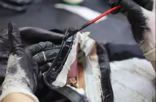 前期工序操作結束后,就要對皮面進行上色補色了,這道工藝尤為重要,首先要調配出與皮面色彩共同的色彩(色盲或色弱者干不了這個職業(yè)),然后摻加其它的輔助材料,對皮面進行涂飾。涂飾后的皮面色彩要均勻,涂層薄厚要適中。這道工藝就如同廚師做菜,配菜、用料、火候、方法缺一不可。