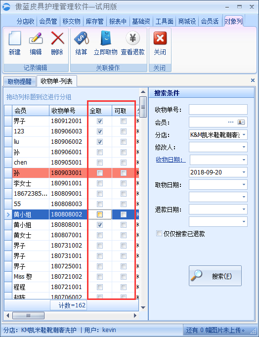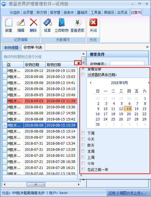 這時,傲藍皮具護理門店管理系統就能給你提供幫助了,簡便快捷的在系統篩選出今天需要通知領取物品的客戶名單。