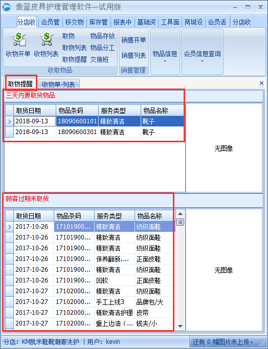 點擊傲藍皮具護理門店管理系統的【門店收銀】導航菜單的【取物提醒】,打開提醒界面中上面是三天內要取衣物列表,下面是顧客過期未取衣列表。如下圖: