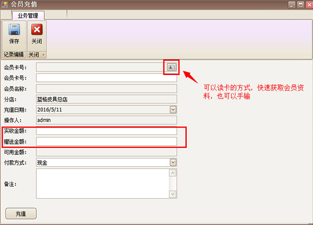 點(diǎn)擊【會(huì)員充值】進(jìn)入充值界面,可以通過(guò)讀卡的方式快速的獲取會(huì)員資料,也可以手動(dòng)輸入,靈活的操作的界面,沖值金額,贈(zèng)送金額,付款方式填寫好,保存