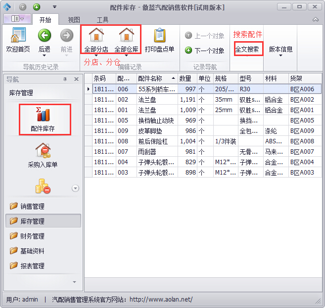 傲藍(lán)汽車配件管理軟件的庫存查詢,可以通過配件名稱等相關(guān)信息查詢,總店管理員賬號(hào)登錄系統(tǒng)可以查詢?nèi)块T店/倉庫的庫存情況,分店管理員賬號(hào)登錄系統(tǒng),只能查詢所屬門店的庫存情況。