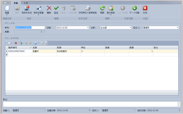 2.新建配件其它入庫單