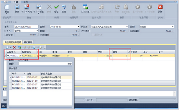 第3步、在供應商退貨單明細中添加退貨明細,即選擇需要退貨的入庫單號、配件編號和輸入退貨的數(shù)量。