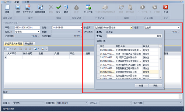 傲藍汽車維修管理系統(tǒng)-新建供應商退貨單詳細界面