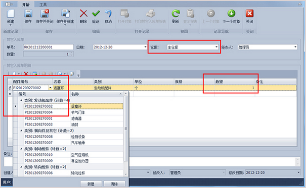 第2步、點擊工具欄的“新建”按鈕,彈出新建其它入庫單詳細界面。選擇入庫的倉庫,添加入庫明細,即選擇入庫的配件編號和數量。