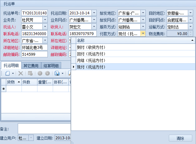 如果是次托運的客戶,那么需要點擊托運人編輯框右邊的箭頭,在彈出窗口中選擇“新建”進行客戶信息的次錄入。同樣的收貨地址也需要通過相同方式進行新建。如果是舊客戶或不清楚客戶信息是否已經在軟件中有記錄,可以在彈出窗口中輸入客戶名稱,如果軟件中已有該客戶的信息,會自動篩選出該客戶的記錄。托運人和收貨人其它信息會自動帶入,也可臨時修改,修改后不會影響客戶在系統中原有的數據,例如在托運單中托運人的聯系電話修改了,在客戶檔案中看到的該客戶的聯系電話還是原來的號碼。